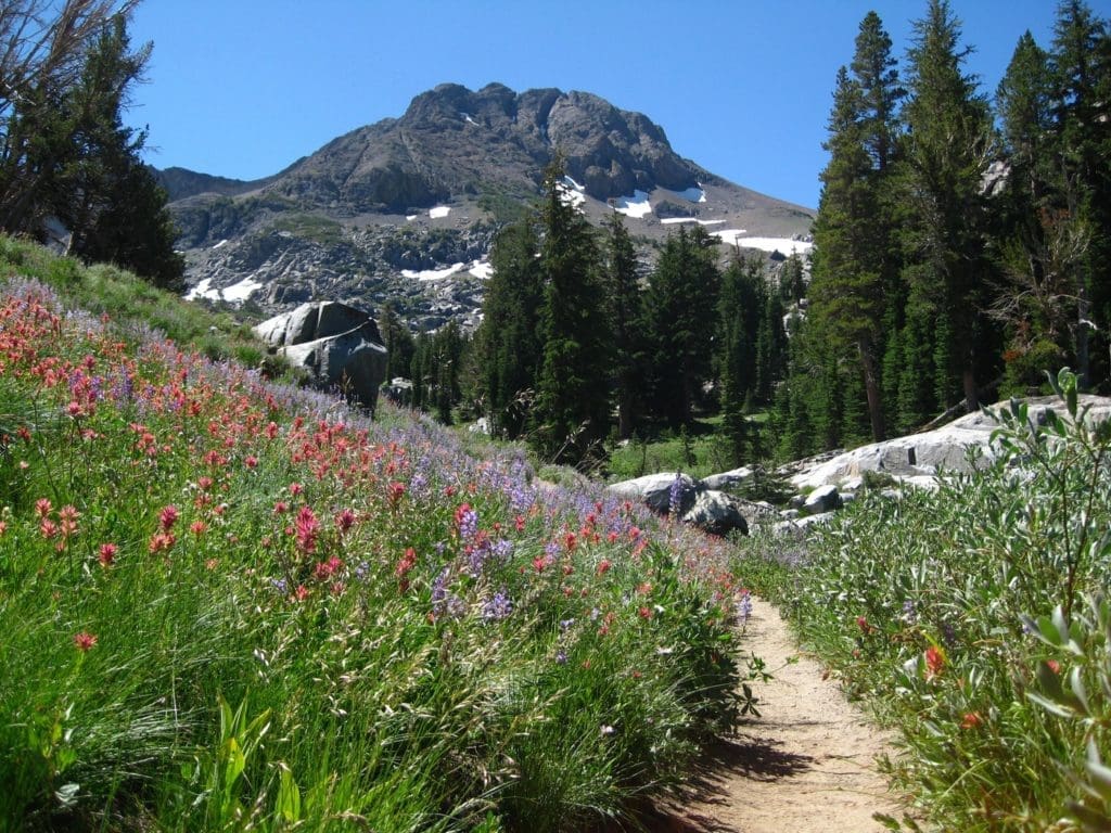 A hidden gem out by Kirkwood, this 7-mile out-and-back trail packs a real Sound of Music moment with its’ rolling meadows of multicolored wildflowers. At the end of the trail, you’ll find Winnemucca Lake; a stunning alpine lake framed by stark granite peaks and lasting snow pack.